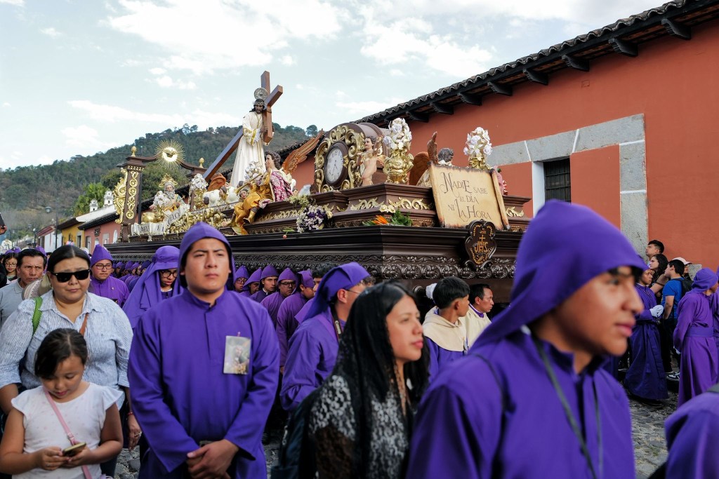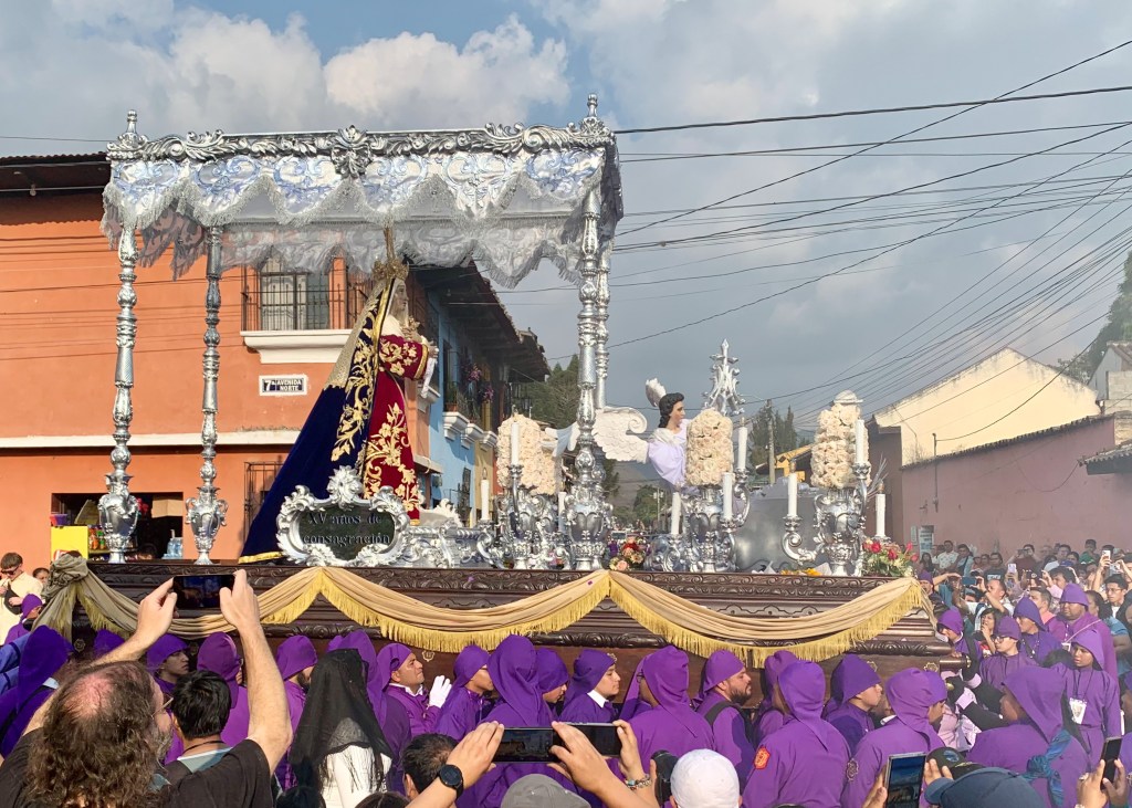 Eventually, a band strikes up and the first of two shoulder-borne religious floats begins to shuffle towards us, preceded by a thick soup of sweet frankincense. It takes twenty men to carry the first float, topped by a statue of Jesus and a large clock. The Spanish inscription claims only God knows time, which is perhaps why the procession is running late. The women carry the smaller second float dedicated to the Virgin Mary. The street is an eruption of purple cloaks, drum rolls, and fragnant smoke.