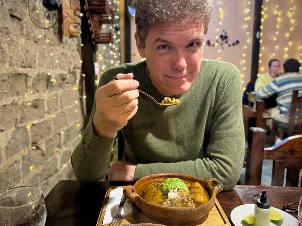 K picks a place called Casa de Las Sopas for dinner. It’s a cosy little place serving what are less “soups” and more hearty casseroles and stews. I opt for a chicken pepián, K for a beef caldo — both excellent. Our friendly server, who can’t stand higher than four-foot-six, is a dead ringer for the diminutive Indonesian woman who used to work at The Waterfront on Lamma.
