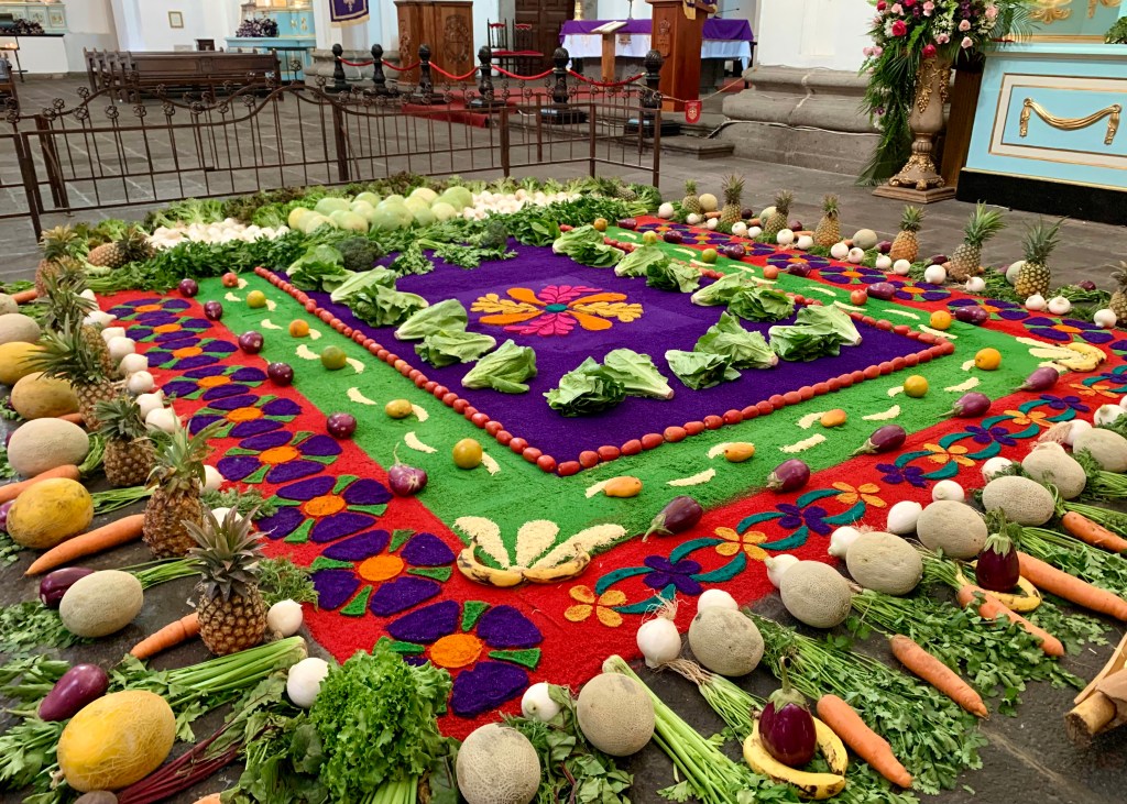 Another pleasantly slow day. We unwittingly choose a perfect time to visit our local church, the Iglesia de la Merced — last Saturday we peered inside, but a wedding was underway. Today it’s decorated for Lent with purple hangings and an ornate carpet of coloured sawdust surrounded by fruits and vegetables, which I later discover represent the garden Jesus visited before his arrest and crucifixion: