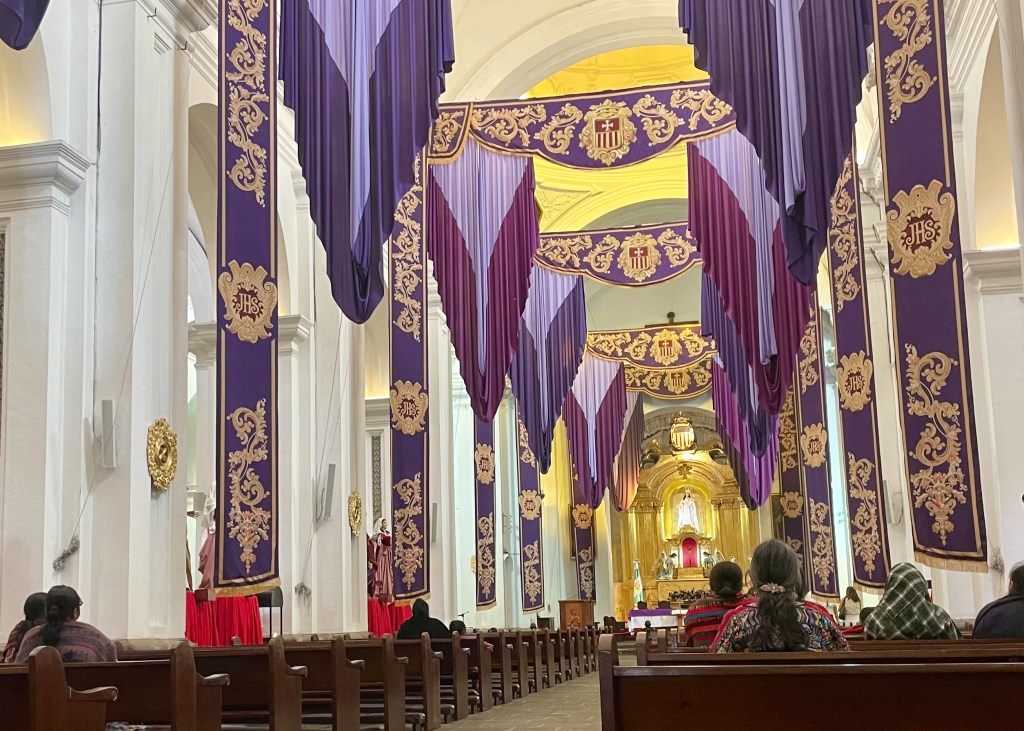 We move onto the San Francisco the Great Sanctuary, our original destination. Like other churches, it’s all dressed up for Lent in purple drapes and a carpet of coloured sawdust. We’ve seen enough ruins for today, so we pass on the adjoining obligatory ruined convent. We have practicalities to attend to: a walk across town to the posh supermarket to stock up on items we suspect we’ll struggle to find in San Pedro: bug spray, baby shampoo (I’ve carried on using it ever since my hair transplant), and lavender tea — such fragile tourists!