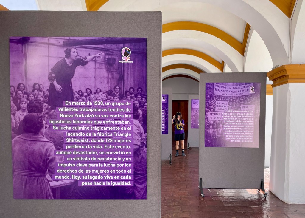 The ruined façade of the Colegio de la Compañia de Jesús has previously caught our eye. It proves more than a ruined façade fronting the rubble of an earthquake-destroyed church. A doorway to the side leads into a restored colonial courtyard housing art galleries and an exhibition tracing the history of International Women’s Day, from its 1900s origins in New York to modern Guatemala.